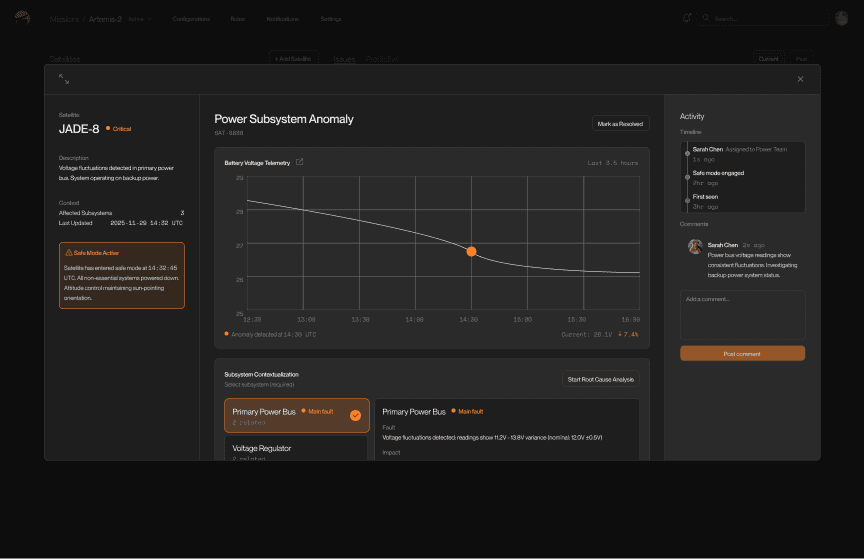 Contextual anomaly views: Affected subsystems, recent commands, related historical issues, and telemetry patterns in a single screen.